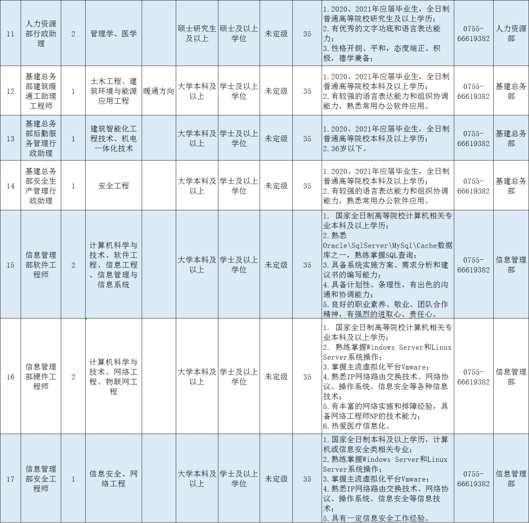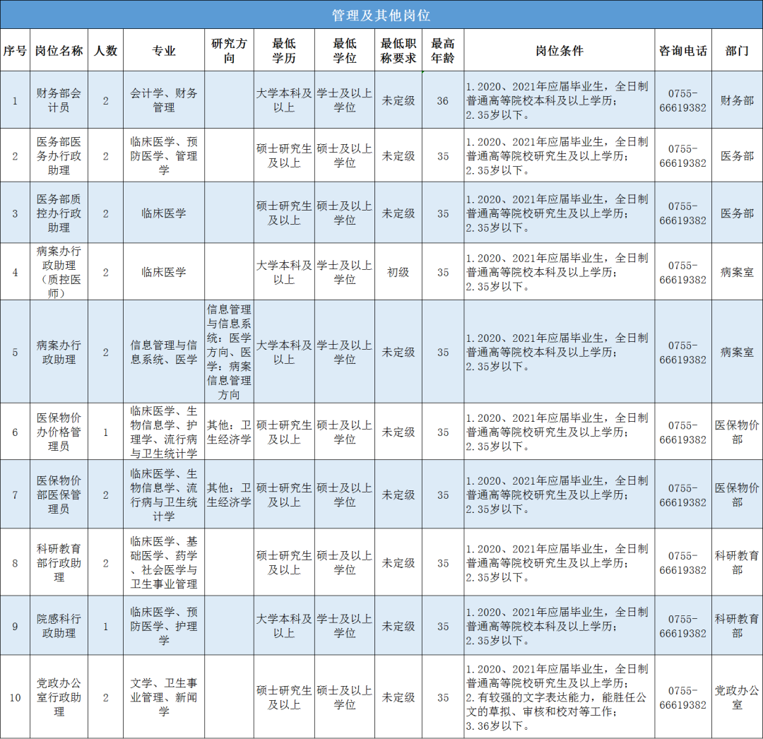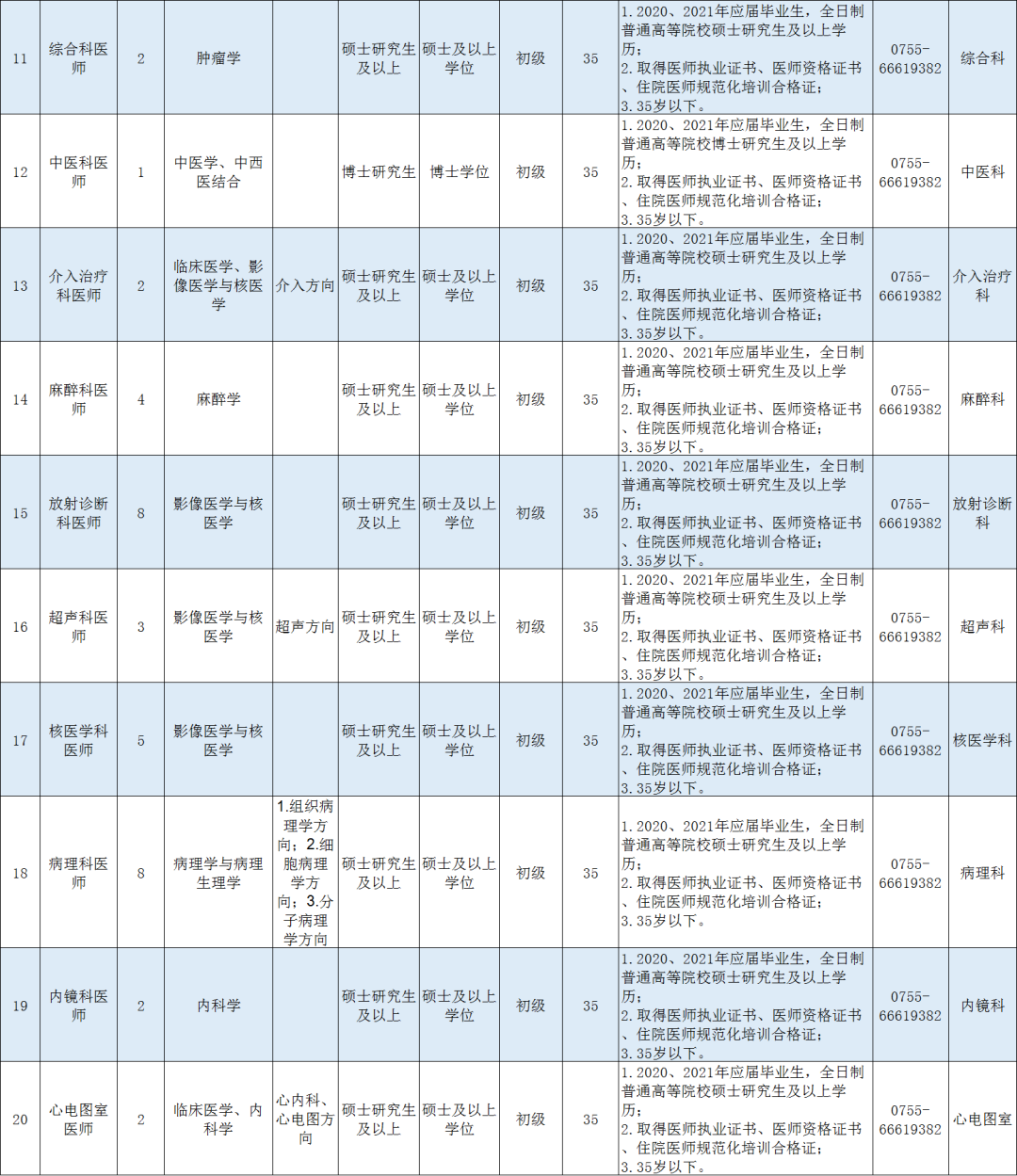 全体医护人员秉承“团结奉献、敬业创新”的理念,立足服务深圳、覆盖中南、面向港澳台、辐射东南亚,力争10年内把医院建设成为集医教研为一体的国际化肿瘤专科医院,为我国的肿瘤防控和诊治事业做出贡献。 中国医学科学院肿瘤医院深圳医院此次面向社会及校园招聘『临床医师岗』、『医技、物理师及科研岗』、『护理岗』、『管理及其他类岗位』4大类!优秀的你抓紧来看看! 基本要求 1.具有中华人民共和国国籍; 2.遵守中华人民共和国宪法和法律; 3.具有良好的品行和职业道德; 4.具备岗位所需的专业和技能条件; 5.具备适应岗位要求的身体条件。 有下列情况之一的,不予接受报考: 1.受过党纪、政纪处分以及正在接受有关部门审查尚未做出结论的人员; 2.2012年1月以来参加我市机关事业单位招聘被认定有考试作弊行为限制报考的人员; 3.未完成教学大纲规定学习内容的结业生、肄业生; 4.非地方班的军队院校应届毕业生; 5.现役军人; 6.违反计划生育政策的人员; 7.法律法规规定的其他情形。 报名方式 请登录网站: http://szch.vhzhaopin.com/ 查看详细招聘信息,并按要求填写完整简历、上传附件。(备注:一个账户仅可投递一个岗位,请提前准备好附件并上传。) 附件类型: 1.个人证件照; 2.学历学位证书扫描件; 3.专业资格证书扫描件(考试通过未取得专业资格证的请提供成绩单); 4.执业证书扫描件; 5.其他与所报岗位相符的从业资格证扫描件; 联系人:贾老师,何老师; 联系电话:0755-66619382、66618150。 福利待遇 ▷在深圳当地具有竞争力的薪酬 2020年社会招聘计划 01临床医师岗位 02医技、物理师及科研岗 03护理岗位 2020年校园招聘计划 01临床医师岗位 03护理岗位 04管理及其他岗位 校园招聘可以根据个人情况,到招聘站点递交简历,或按照上方统一报名方式递交简历。 2020年校园招聘站点